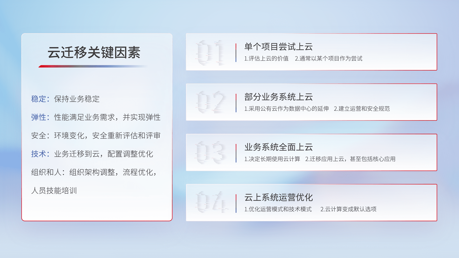 结合实际业务,,,从规划设计、、、云平台选型、、、云原生改造、、数据迁移、、集成交付,,迁移全过程为客户识别最佳上云路径,,做好风险识别管理,,,设计网络架构、、身份权限、、、安全审计合规、、操作审计、、、日志审计、、、监控告警策略、、多站点容灾设计等,,,对云上基础设施进行整体规划,,,提升IT治理水平,,,以满足弹性、、、高可用、、高性能的需求。。。。